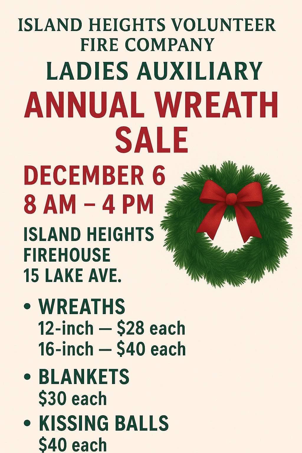 Share Dec 01 2025 Annual Wreath Sale Stop by the firehouse this Saturday December 6th and support our Ladies Auxiliary at their Annual Wreath Sale!